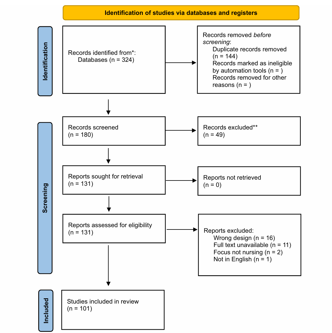 为全面捕捉护理研究中比较分析的应用情况,本研究采用范围综述的研究设计,依据Joanna Briggs Institute(JBI)指南和PRISMA-ScR标准进行系统检索与报告。文献检索于2023年9月进行,覆盖CINAHL、ProQuest Central、Medline和Directory of Open Access Journals四大数据库,检索策略限定在文章标题中包含“comparative analysis”及“nurs*”的英文文献,未设定时间范围以获取自最早可查记录以来的全部相关研究。初检共获得324条记录,经EndNote及Covidence软件去重后得到180篇文献进行标题与摘要筛选,排除不符合条件的49篇后,对剩余的131篇进行全文评估。最终有101篇研究符合纳入标准,包括期刊论文与学位论文。数据提取内容包括作者、发表年份、发表载体、研究地点、研究目的、设计类型、比较分析方法描述、所依据的理论框架、比较的性质以及研究对象等。两名评审员独立完成筛选与数据提取,分歧通过讨论解决。由于本研究关注的是方法应用的范围与特征而非研究质量,因此未进行质量评价。数据分析采用总结性内容分析法,对纳入文献进行描述性统计与主题归类。
