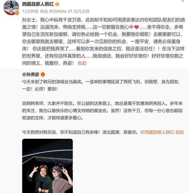 10月8日,韩红再发文表白感谢孙燕姿:孙女士,我心中纵有千言万语,此刻却不知如何用语言表达对你和团队朋友们的感激之情!远道而来,带病支持我……这一切都留在我心中❤……舍不得你走,多希望自己生活在新加坡啊,请你务必给我一个机会,我要陪你唱歌!去哪里都可以,你去哪里我就去哪里,这样可以多一次见到你的机会,一路平安,请务必保重身体! 你还是把我弄哭了……看到你发来的信息之后,我还是没忍住!!在当下这样的世界里,还有你这样真挚的人……我很感动,我会好好珍惜你!好好珍惜你我之间的情义,我爱你,燕姿!