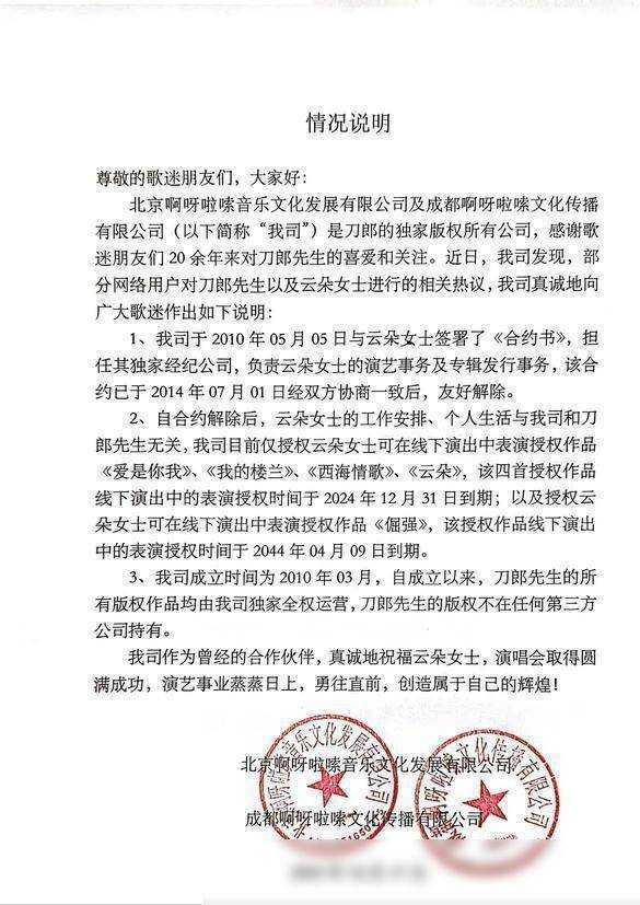 但刀郎却只发了一份声明,称与云朵早已没有合作关系,对方的工作安排个人生活均与刀郎公司无关。