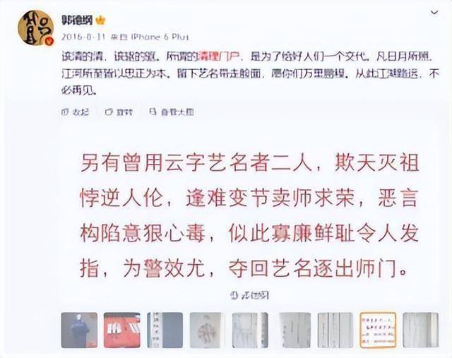 此时矛盾还未公开,直到 2016 年郭德纲重修家谱,直接将曹云金除名,怒斥其 “欺天灭祖、卖师求荣”,还要收回 “云” 字艺名。这一举动彻底点燃战火。