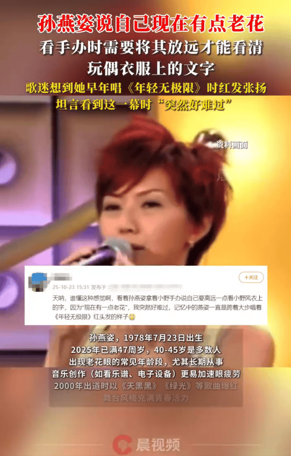 这一幕让许多听众联想到她早年演唱《年轻无极限》时那个红发飞扬、活力四射的模样,不禁感慨时光流转。1978年7月23日出生的孙燕姿,2025年已满47周岁。医学研究表明,40-45岁正是老花眼的高发年龄段,而长期从事音乐创作需要频繁阅读乐谱、使用电子设备,更易加速视觉疲劳。
