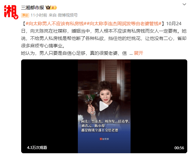 10月24日,向太陈岚在社交媒体分享了对婚姻中财务管理的独特见解。她明确提出在婚姻关系中“男性不应保留私房钱,而女性必须拥有个人积蓄”的观点。