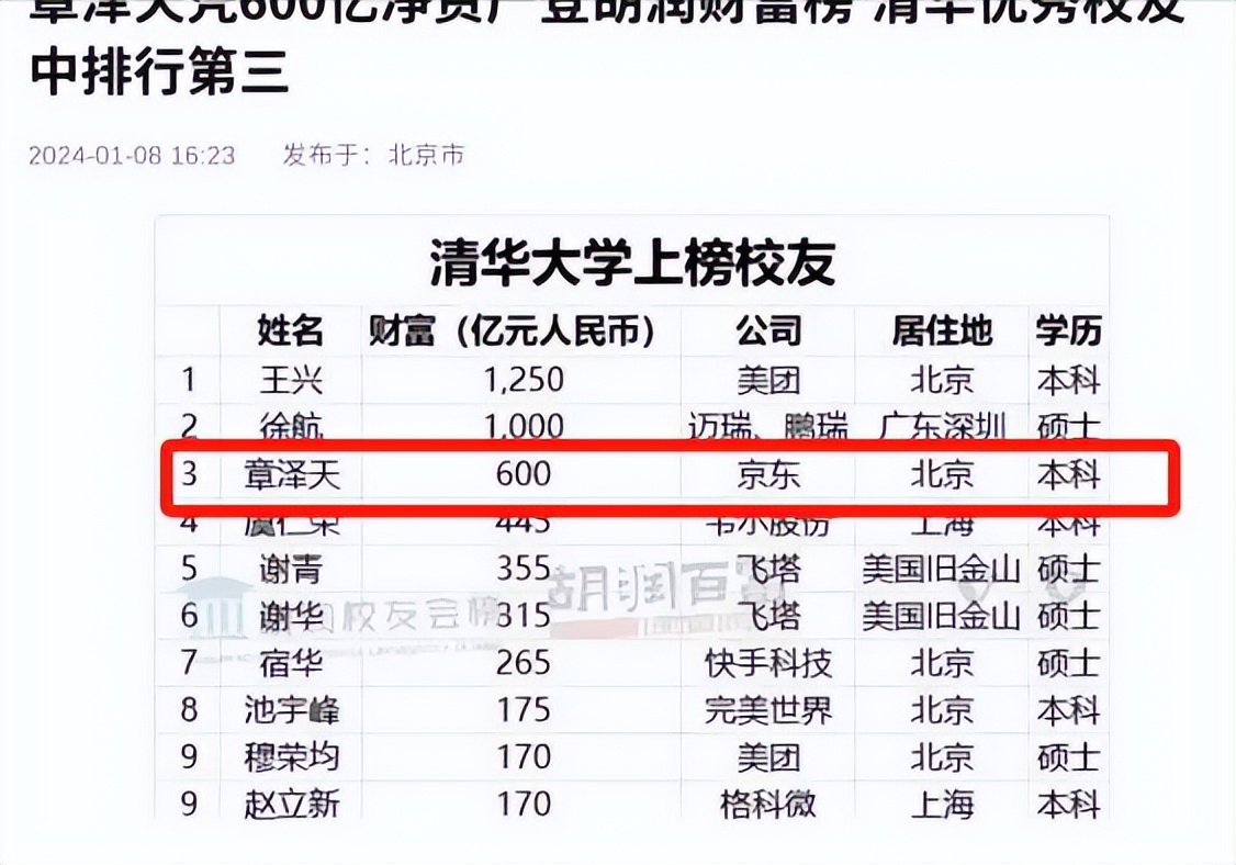 据2024 年胡润报告显示,章泽天以 600 亿元净资产位列清华校友第三。