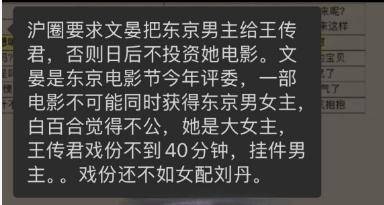 在白百何用“还能这么操作”、“得鱼忘荃”、“过河拆桥”内涵时,便有网友爆料“沪圈资本”要求评委文晏选《春树》男主王传君当影帝,引发白百何不满。