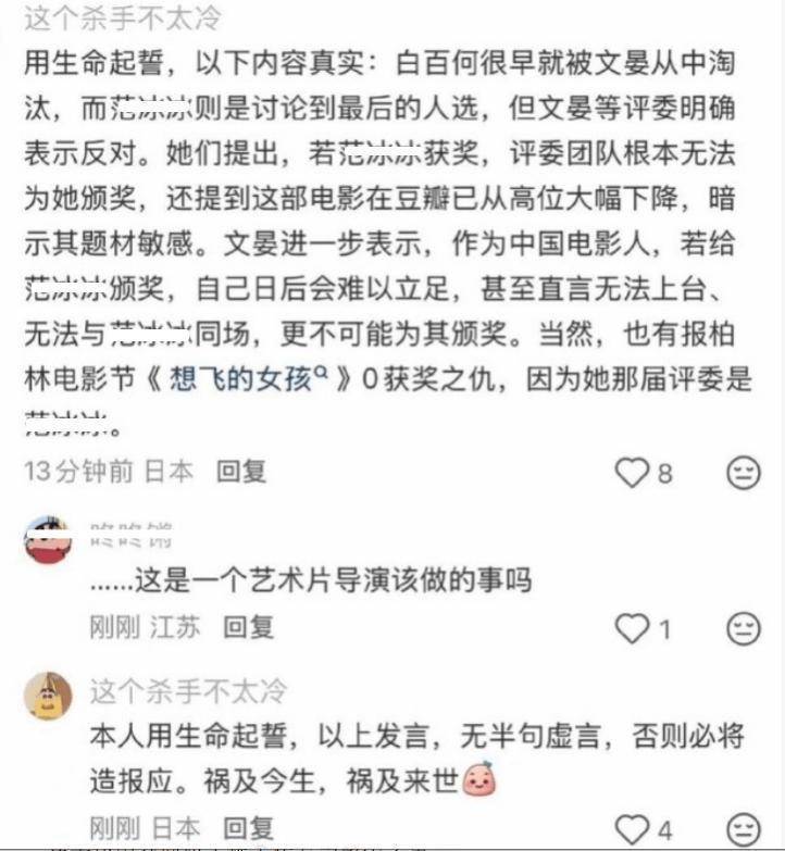 与白百何发文时一样,网友的“解答”爆料也随之而来,且内容更加详细更加劲爆,直指评委文晏以“自己日后会难以立足”为由拒绝给奖。