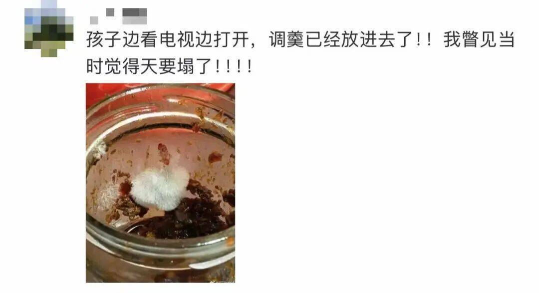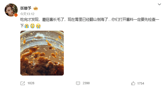 11月5日,演员张馨予在社交平台晒文:吃完才发现,蘑菇酱长毛了,现在胃里已经翻山倒海了…你们打开酱料一定要先检查一下
