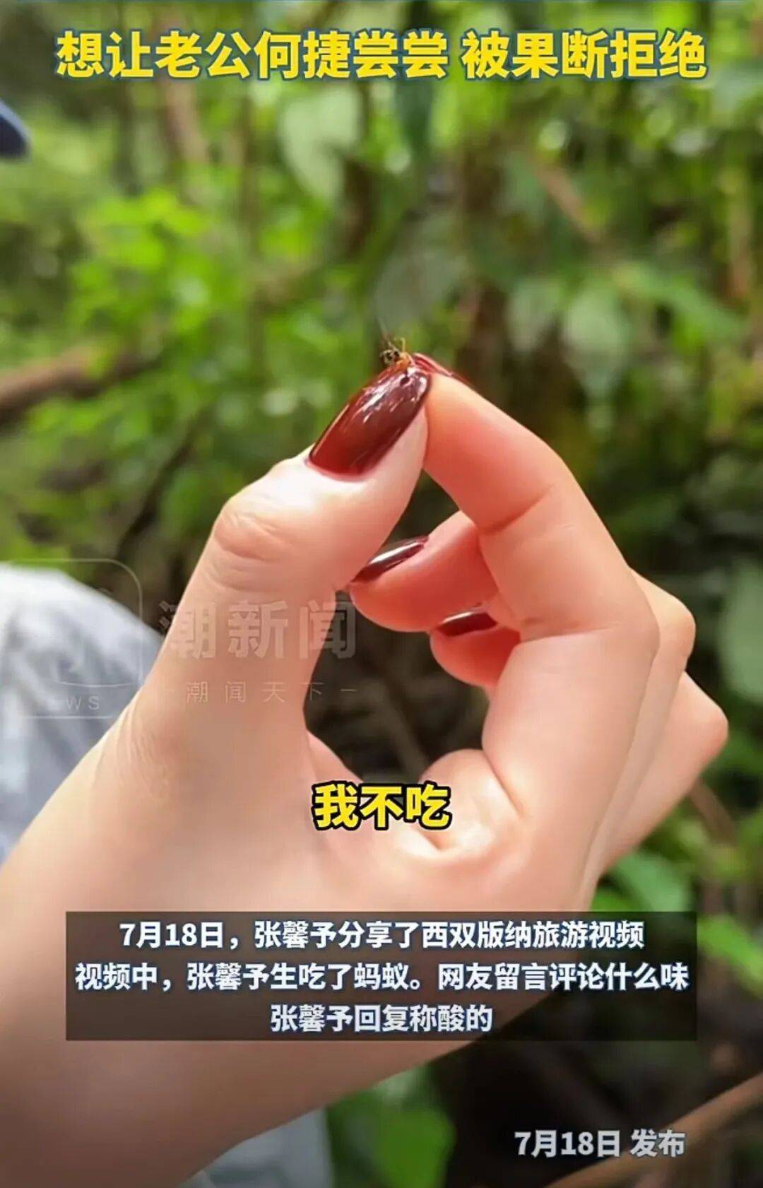7月18日,演员张馨予在个人社交平台发布视频,她前往云南西双版纳一个景区游玩,视频中她不仅手拿毛毛虫,还直接生吃了一只蚂蚁,画面随即引发网友热议。