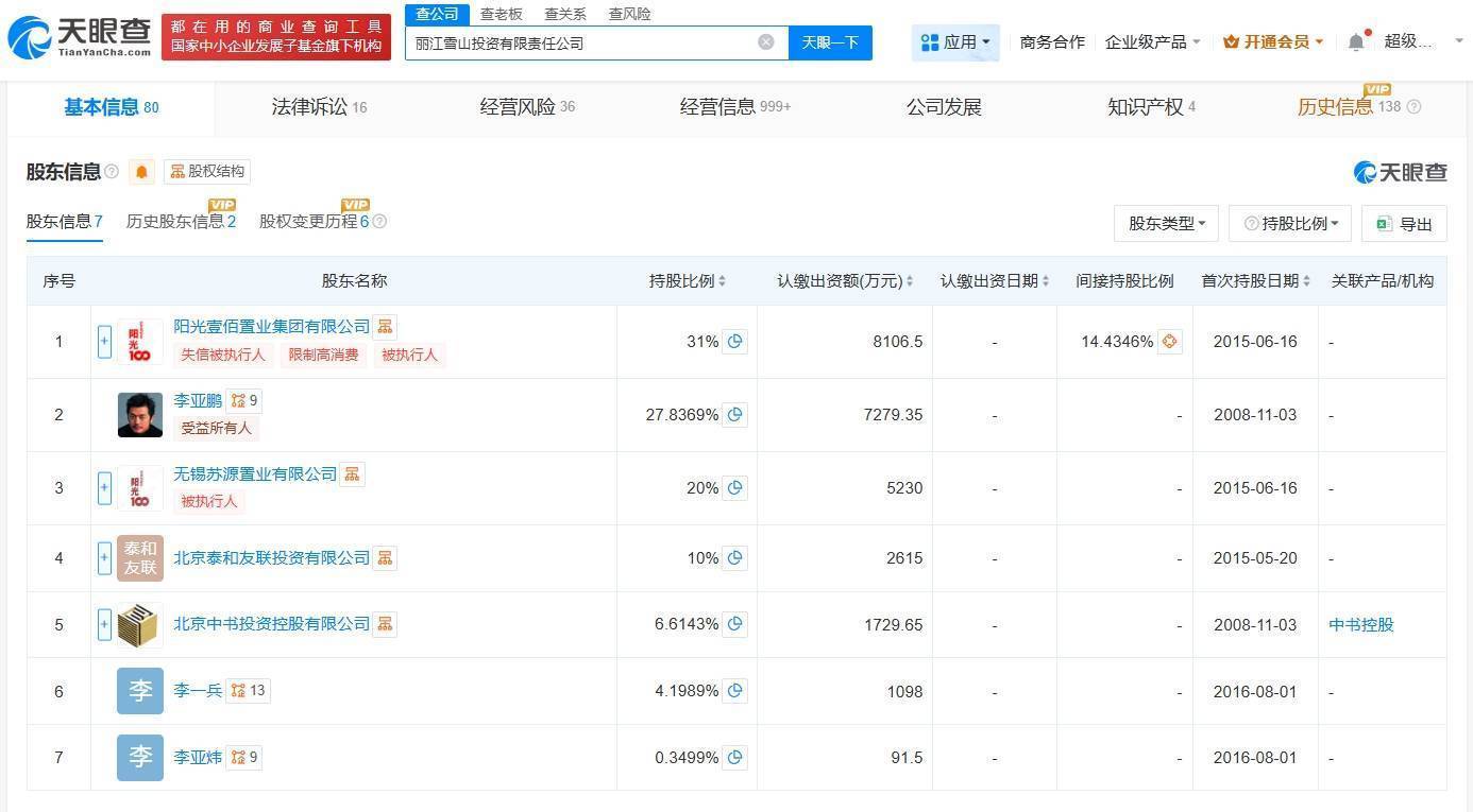 根据天眼查发布的商业风险信息显示,丽江雪山投资有限责任公司于11月6日新增破产审查案件,申请方为阳光壹百置业集团有限公司,目前已由丽江市古城区人民法院立案处理。