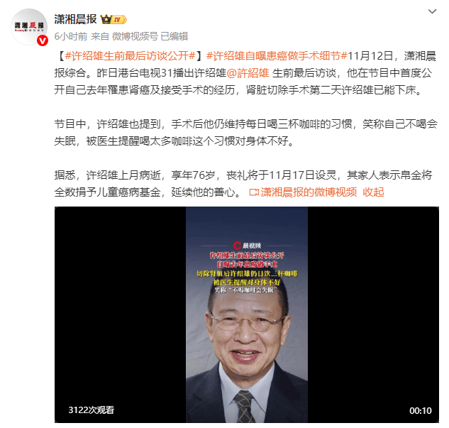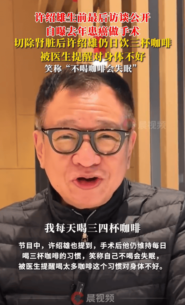 11月12日,许绍雄生前最后访谈播出,他在节目中首次公开了自己去年患癌及接受手术的经历。许绍雄表示,手术后他仍维持每天喝三杯咖啡的习惯,还称自己不喝会失眠,还被医生叮嘱喝过多咖啡会对身体不好。