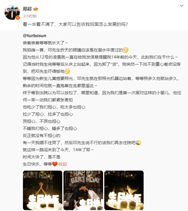 13日,演员孙俪发布长文为儿子等等庆祝14岁生日。丈夫邓超看到这篇饱含温情的庆生文后,随即转发并俏皮回应:“看一半看不清了,大家可以告诉我后面怎么发展的吗?”一句看似调侃的话,瞬间戳中网友笑点与泪点,评论区里众人纷纷调侃:“不用问,一猜就知道超哥已经哭成泪人了。”