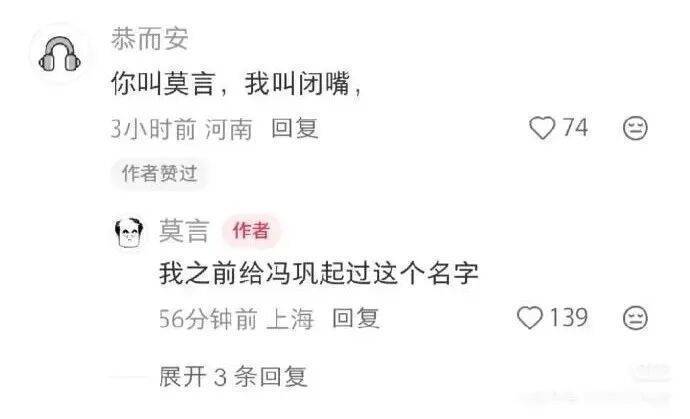 有网友说:你叫莫言,我叫闭嘴。莫言回复:我之前给冯巩起过这个名字。