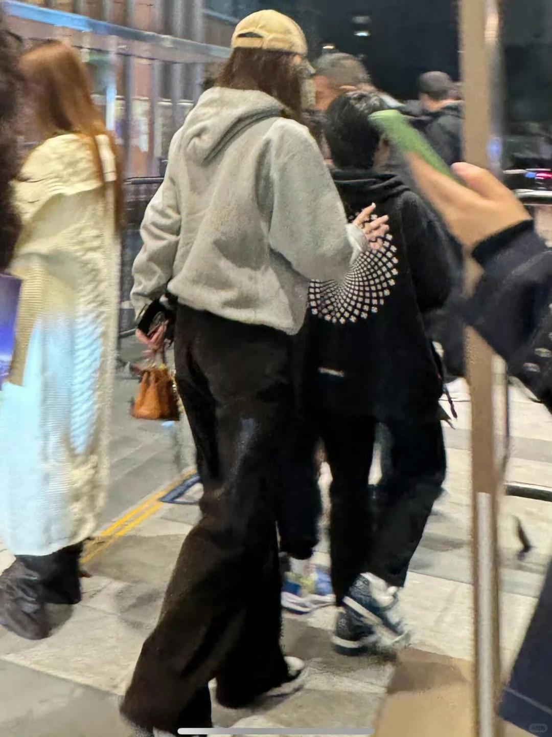 鼻姐当天穿了一件白色的外衣,只不过因为照片太过模糊,实在是看不清她手上拎着的是包还是衣服。