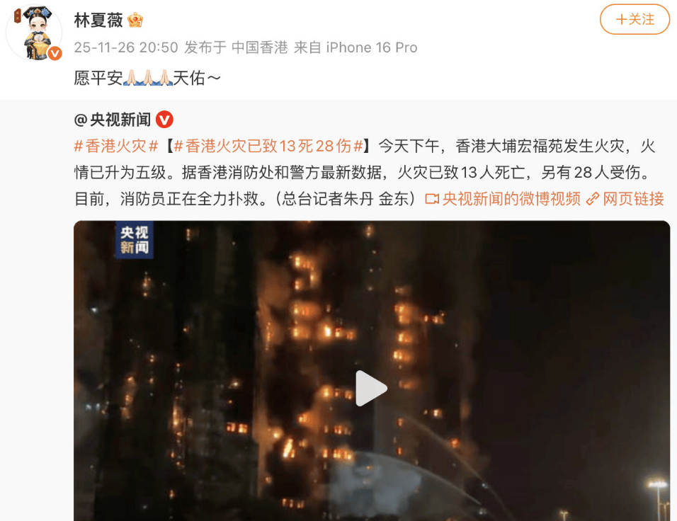 11月26日下午,香港大埔宏福苑发生火灾。当晚,欧阳震华、林夏薇、奥斯卡等明星纷纷在社交媒体平台发文为火灾中的的受灾人民祈福。愿平安!