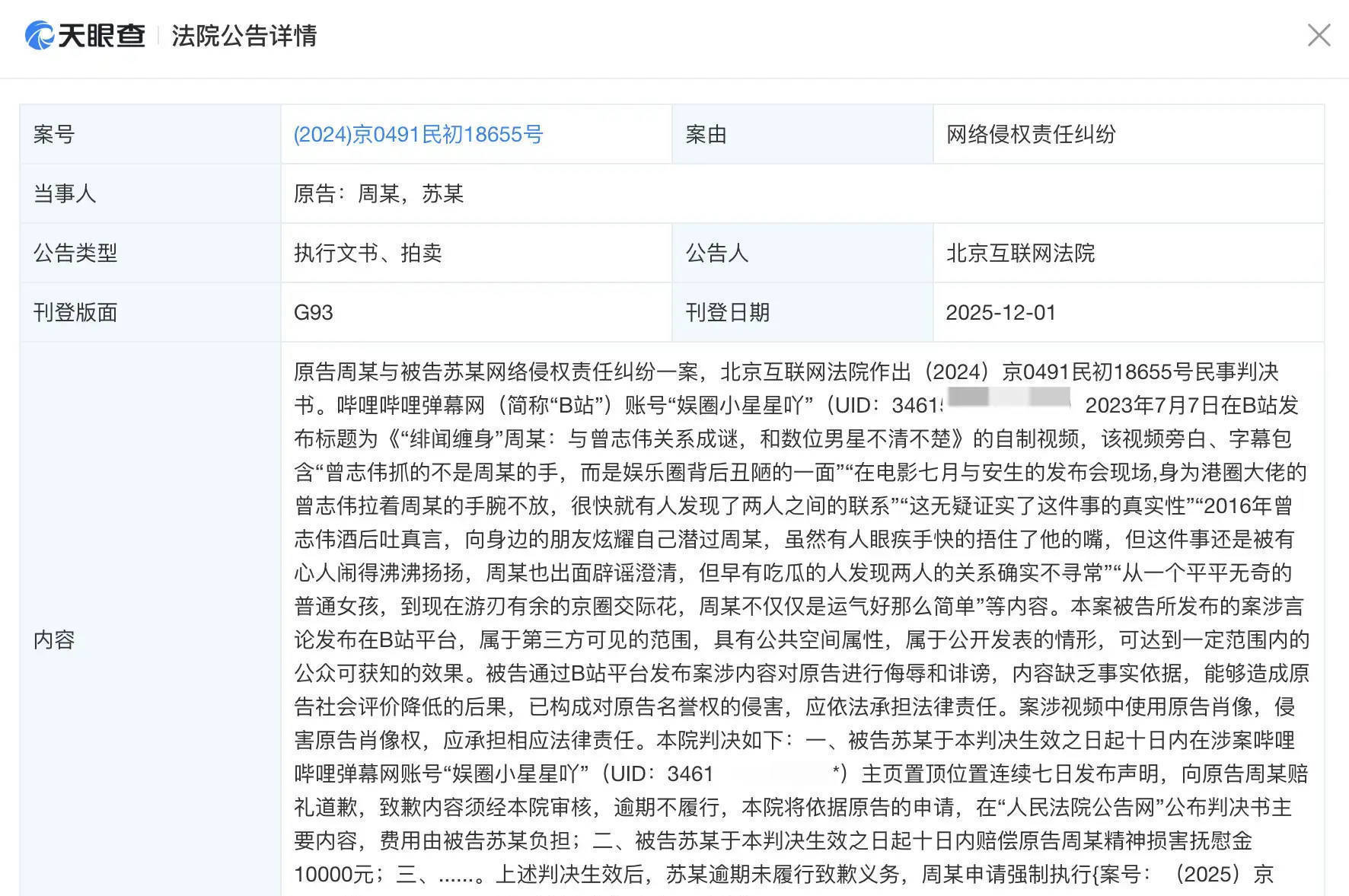 天眼查信息显示,近日法院公布了周冬雨起诉苏某某网络侵权纠纷的民事判决书。判决书指出,被告苏某某曾公开发布 “曾志伟潜规则周冬雨”“周冬雨是京圈交际花” 等言论,已侵害周冬雨名誉权,法院判令苏某某于判决生效起十日内公开向周冬雨赔礼道歉,并赔偿 1 万元精神损害抚慰金。因判决生效后苏某某未按期履行致歉义务,周冬雨已申请强制执行。
