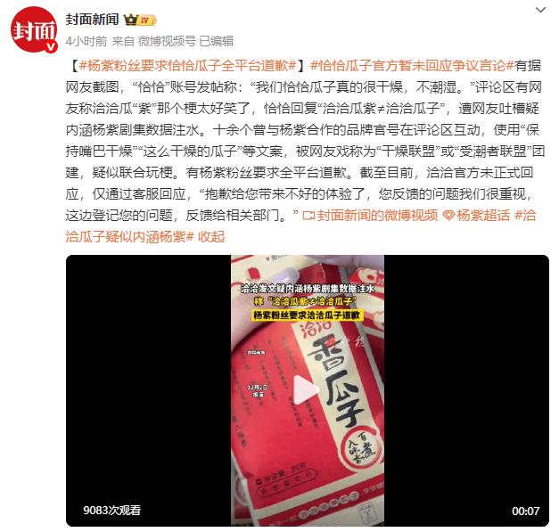 洽洽瓜子疑内涵杨紫剧集数据注水,粉丝喊话要求全平台道歉