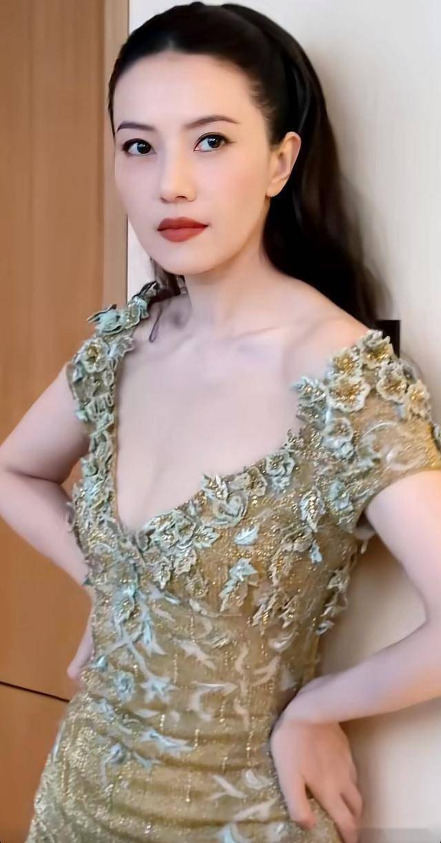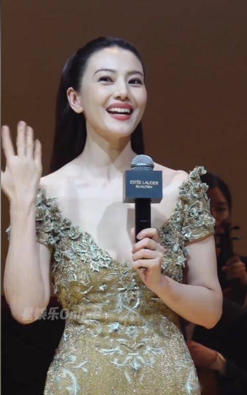 她一出场就成了焦点,礼服的深V领口在灯光下反射出金色光晕,裙身紧致贴合腰肢,展现出她常年保持的纤细身材。