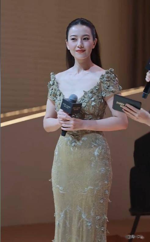 镜头下,她身穿一件金色深V礼服,裙摆上缀满精致的刺绣,在聚光灯下闪耀着低调的奢华光芒。