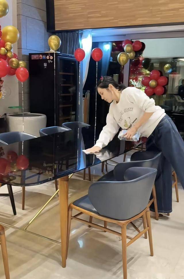 秋瓷炫不需要出镜工作的时候时候,整个人就是很居家的媳妇模样,穿着卫衣牛仔裤特别休闲,头发随意梳着,自己拿着湿巾把餐桌椅子都打扫干净,本质就是非常勤劳热爱生活的人。