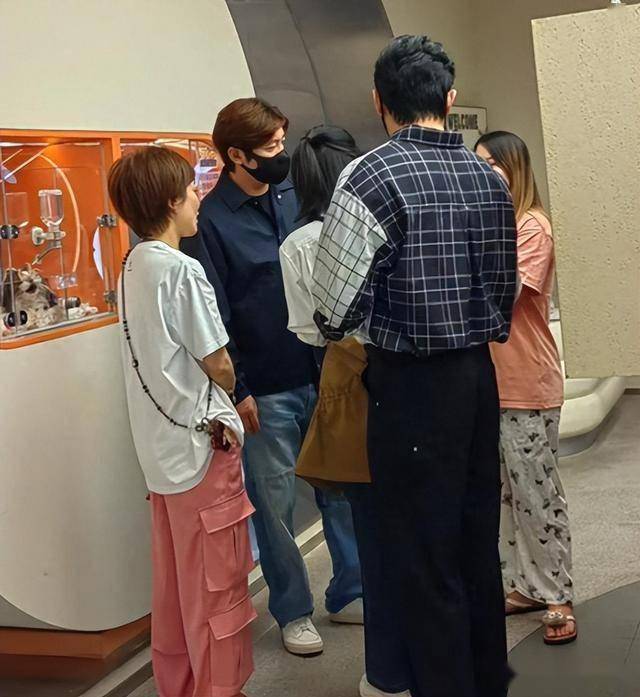 两家常聚会,最近鲍蕾夫妇和郭京飞在宠物店偶遇,陆毅穿格子衫黑裤,鲍蕾年轻有活力,郭京飞黄头发松弛范儿,三人聊得开心。