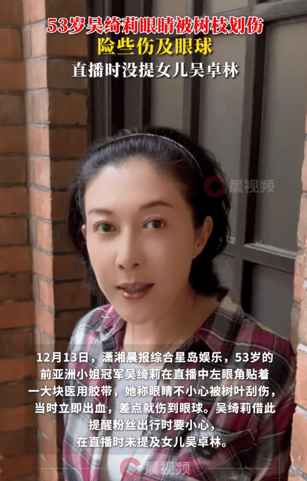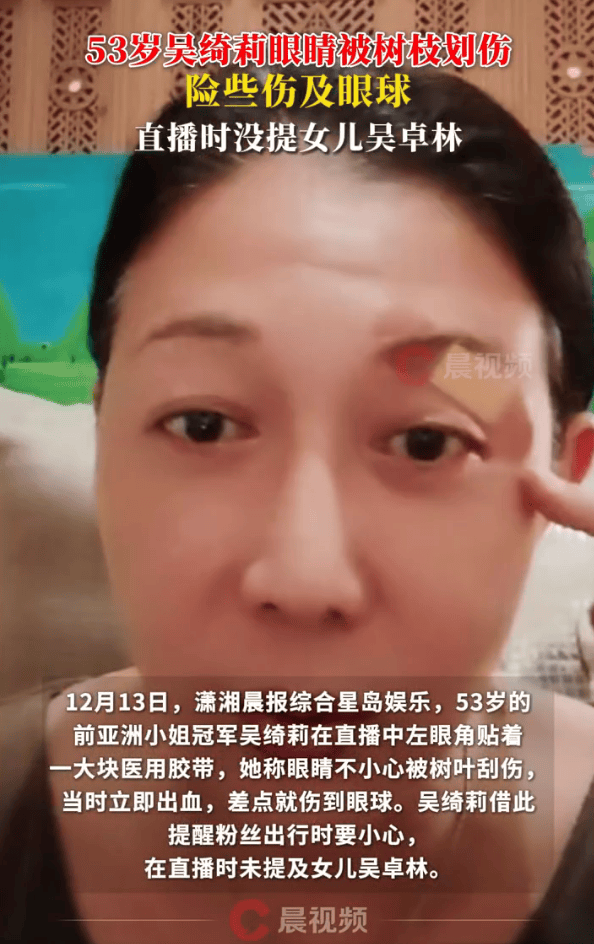 12月13日,53岁的前亚洲小姐冠军吴绮莉开启直播,她的左眼角贴着一大块医用胶带。她坦言自己的眼睛不慎被树叶刮伤,受伤当时就流了血,差一点就伤到眼球。吴绮莉还借着这件事提醒粉丝外出时务必多加小心,不过整场直播里,她都没有提到女儿吴卓林。