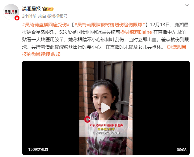 53岁吴绮莉直播回应受伤:眼睛被树枝划伤险伤眼球
