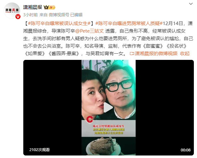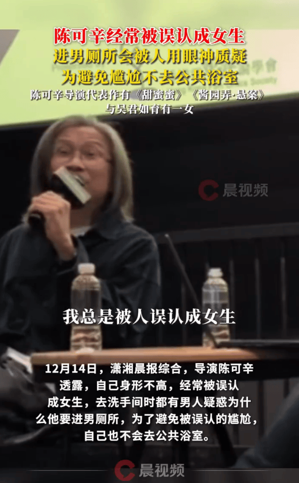 12月14日,导演陈可辛坦言,因为自己个子不高,常常被人误认成女生,就连去洗手间时,都会有男士疑惑他为什么要走进男厕所。为了避免这种被误认的尴尬,他也从来不会去公共浴室。陈可辛,知名导演、监制,代表作有《甜蜜蜜》《投名状》《如果爱》,与吴君如育有一女。