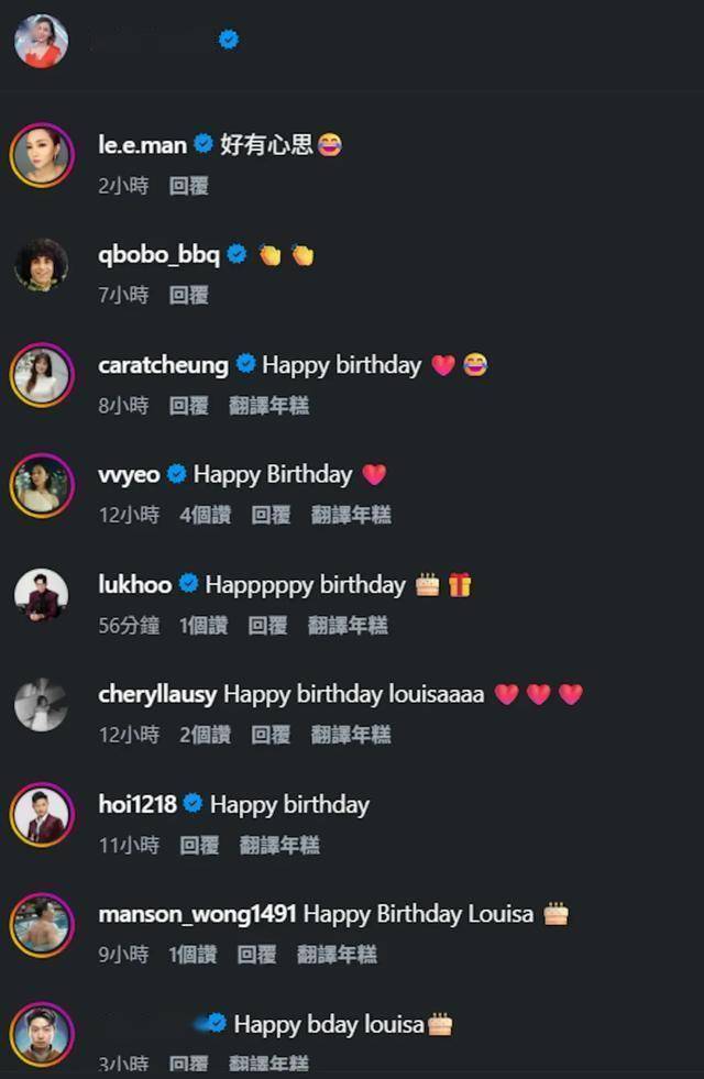 帖文发布后,获得不少圈中人祝福,包括陈炜、杨秀惠、乔宝宝、陆浩明等。李绮雯称赞盛劲为“好有心思”,陈懿德则留言:“你的表情看起来惊吓多过惊喜Happy birthday”