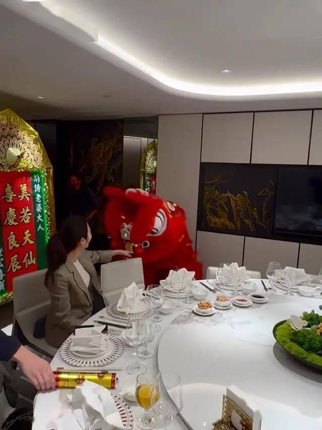 从视频可见,素颜打扮的麦明诗一踏入酒楼包厢便面露茫然。现场布置仿如置身传统戏棚,以竹架搭建了巨型花牌,其中一块上款写着“明诗老婆大人”,下款则是“老公喜贺”,更盛赞太太“美若天仙 喜庆良辰”。