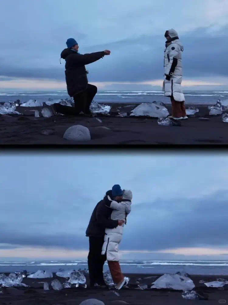 2025年12月23日 金莎在冰岛钻石沙滩被小19岁的孙丞潇成功求婚 求婚视频里 孙丞潇单膝跪地的瞬间 金莎的笑容比漫天极光还要耀眼 冰岛的极光漫过黑沙滩 美得像电影里的场景 所有风景都成了这场浪漫的见证 求婚成功后 孙丞潇一把抱起金莎在浪花前拥吻 甜度直接拉满。