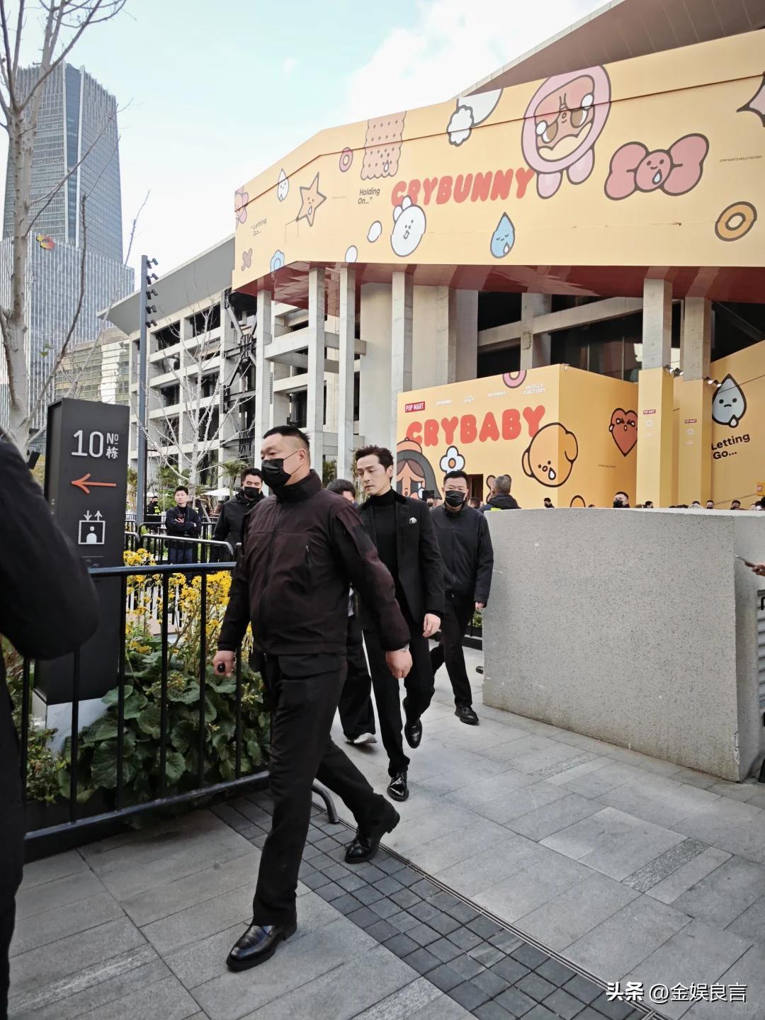 他身材修长,穿上黑色西装后更显高挑,出场时身边有保安保驾护航,步伐稳健。