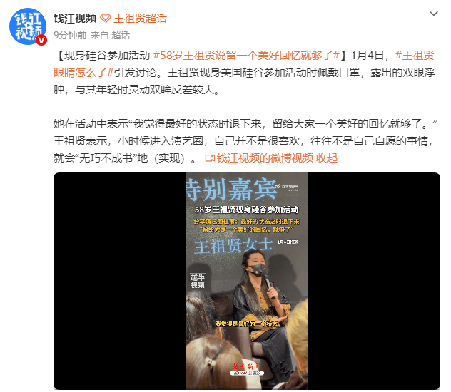 1月4日,“王祖贤眼睛怎么了” 的话题在网络上引发广泛讨论。原因是王祖贤现身美国硅谷的一场活动时,全程佩戴口罩,仅露出的双眼显得有些浮肿,和她年轻时灵动亮眼的模样反差明显。