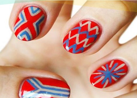蓝色和红色的搭配略带有些海军风的感觉,波普风mix海军风是一款很有特色的美甲,几何图案加上几何曲线搭配,让人眼前一亮,小编个人很喜欢这一款呢。