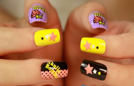 这款可爱美甲是日系卡通涂鸦的风格,款式很独到很新颖,颜色搭配也很亮瞎人眼,还很显手白呢。