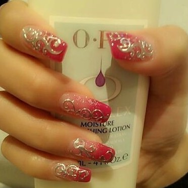 如果比较喜欢复古传统的,小奈也能满足你,这款渐变红粉新年美甲很有传统味道吧?复古的银色图案点缀在红粉甲油上,很独特。
