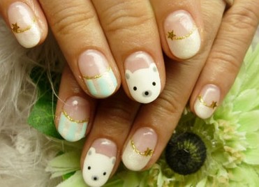 萌萌的小白熊也来凑热闹了!以白色指甲油做底色,金色勾边并用星星点缀,再配以粉绿条纹相间,让人不禁感叹,原来法式美甲也能这么萌!