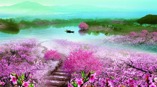 步入桃花林,满目光华灿烂;