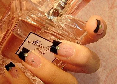 白色法式美甲,精致的蝴蝶结图案,2013年最流行大热哦!甜美有木有??真的很好看,衬托出白皙指尖,利用哑光的圆片点缀,又可爱生动起来。
