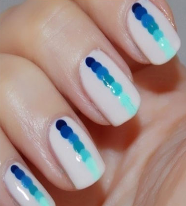 用白色甲油打底,用不同深浅度的蓝色点圆点,连成一条直线,从深到浅的点缀,打造出渐变的效果。很特别新颖的一款美甲,上手也很漂亮的哦!