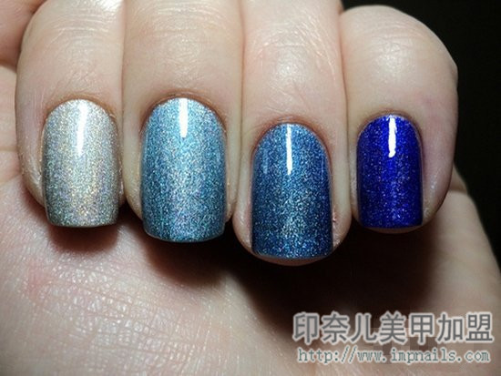 第一款:蓝色创意美甲,颜色从浅到深层层递进,简单易学又不落俗套。